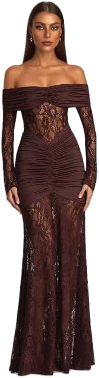 Style: Mermaind maxi dress for women, ruched cocktail party maxi dress for women,foamal lace dress, off shoulder long dress, long sleeve bodycon fall dress for women, formal wedding guest dress for women