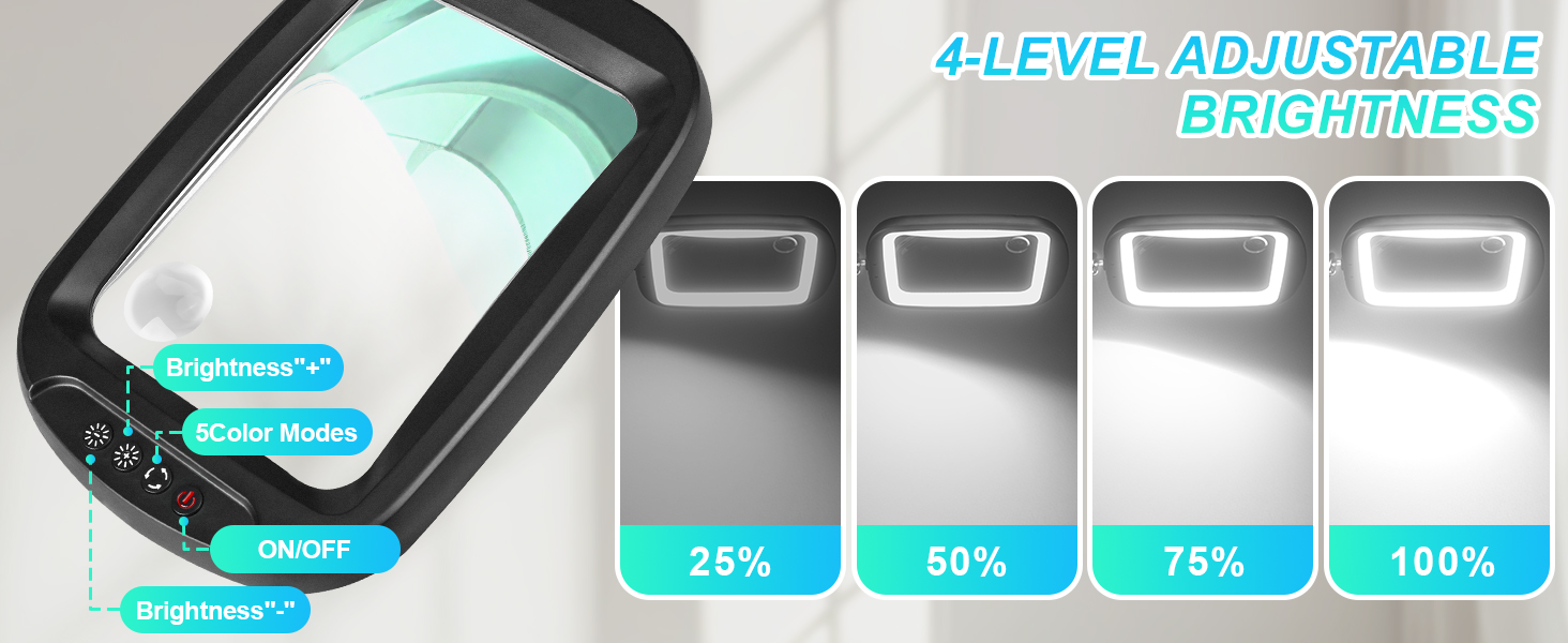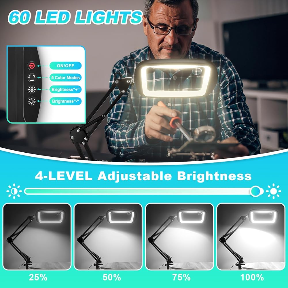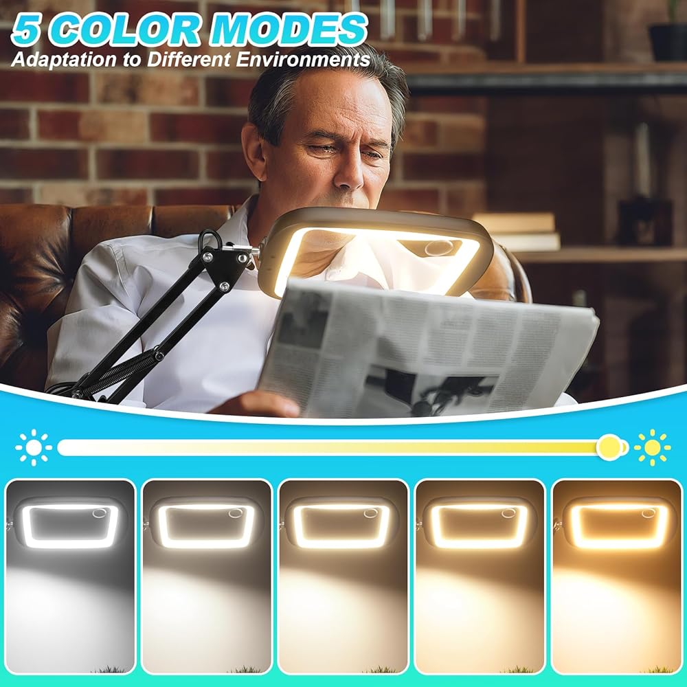 5 Color Modes & 4 Adjustable Brightness Levels: Featuring 5 adjustable color temperatures and 4 levels of LED brightness, this magnifying lamp allows you to customize both brightness and light color. Achieve perfect lighting conditions for any project, whether you're reading newspapers, crafting, doing puzzles, crocheting, or various other arts and hobbies.