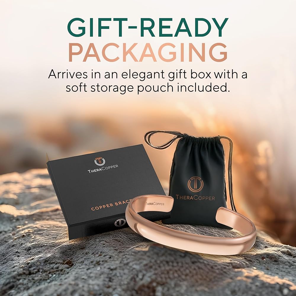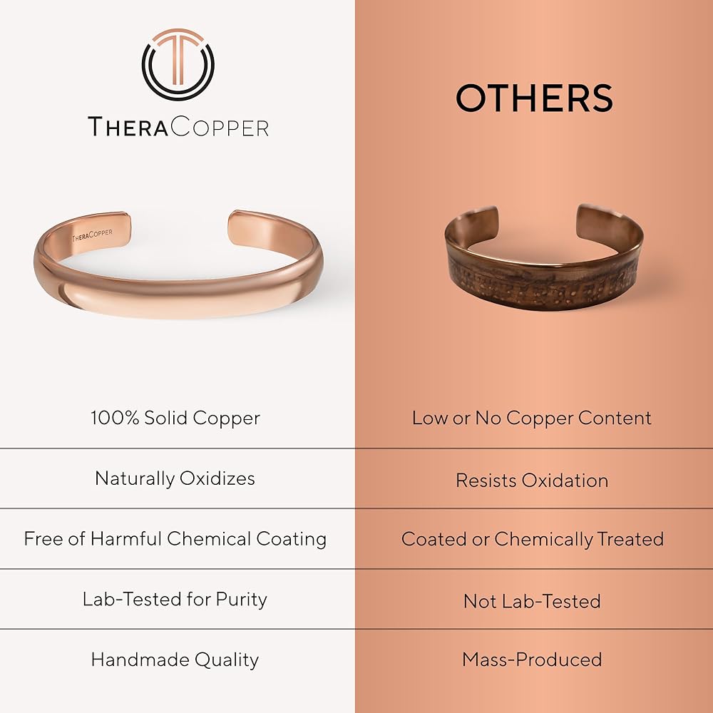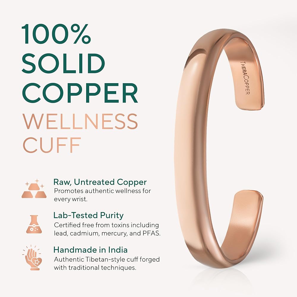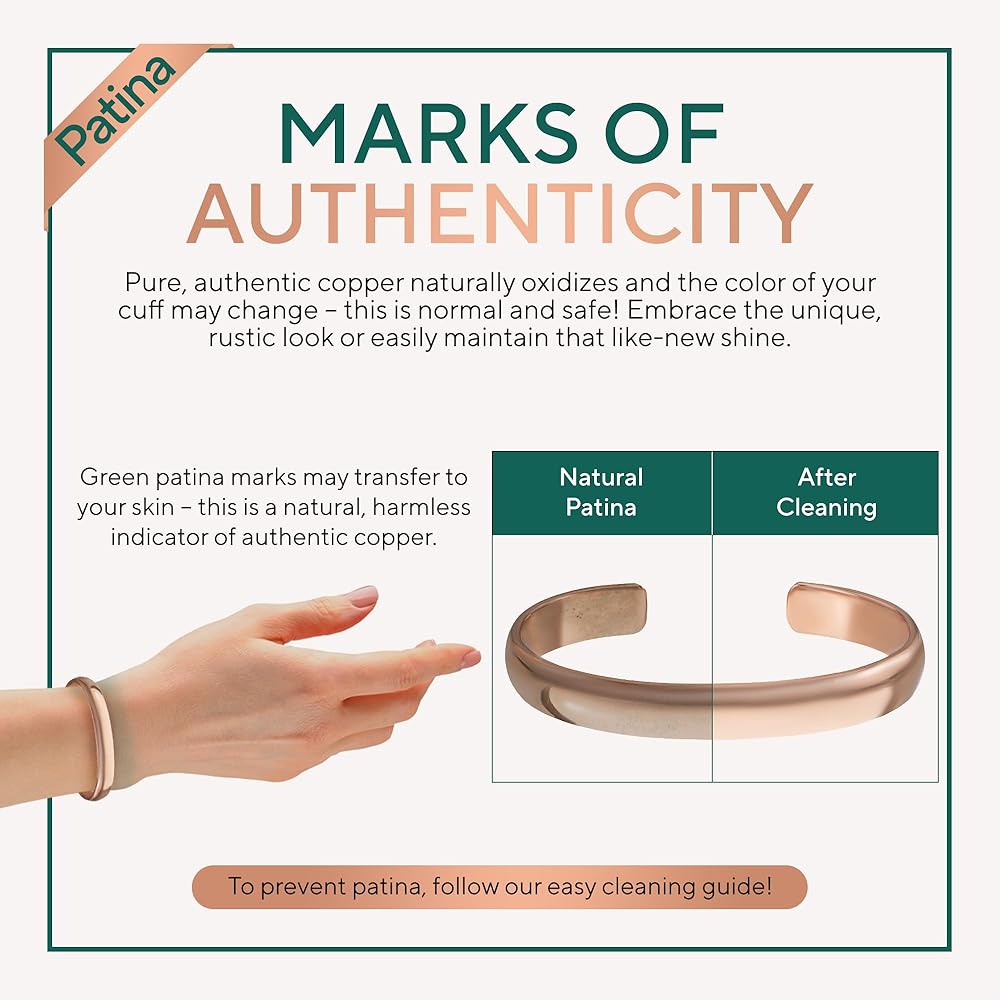 THE PUREST COPPER: Handcrafted with 100% pure copper, our real copper bracelet is lab-tested and certified free from harmful metals like lead, nickel, cadmium, and PFAS. Unlike cheap mixed copper or plated bracelets with toxic coatings, TheraCopper is completely natural, untreated, and safe. Over time, your pure copper cuff bracelet develops a natural patina—a hallmark of authentic copper. Restore its original shine easily with salt and lemon juice or any copper cleaner.