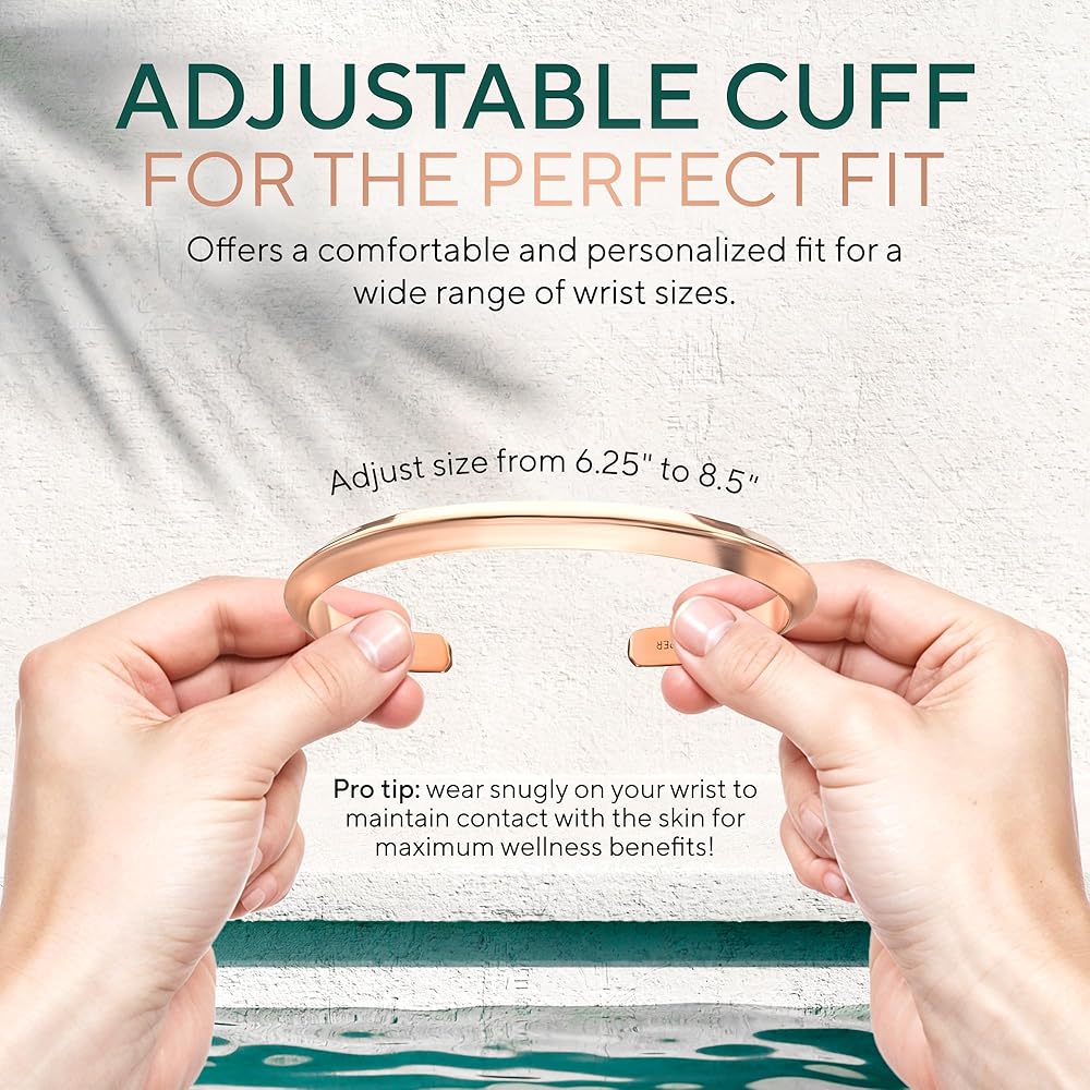 ADJUSTABLE FIT: Designed for all-day comfort, the open-cuff copper bracelet adjusts to fit wrist sizes 6.25" to 8.5" (SMALL to X-LARGE). Perfect for both men and women, the customizable fit ensures a secure yet comfortable feel without compromising style.