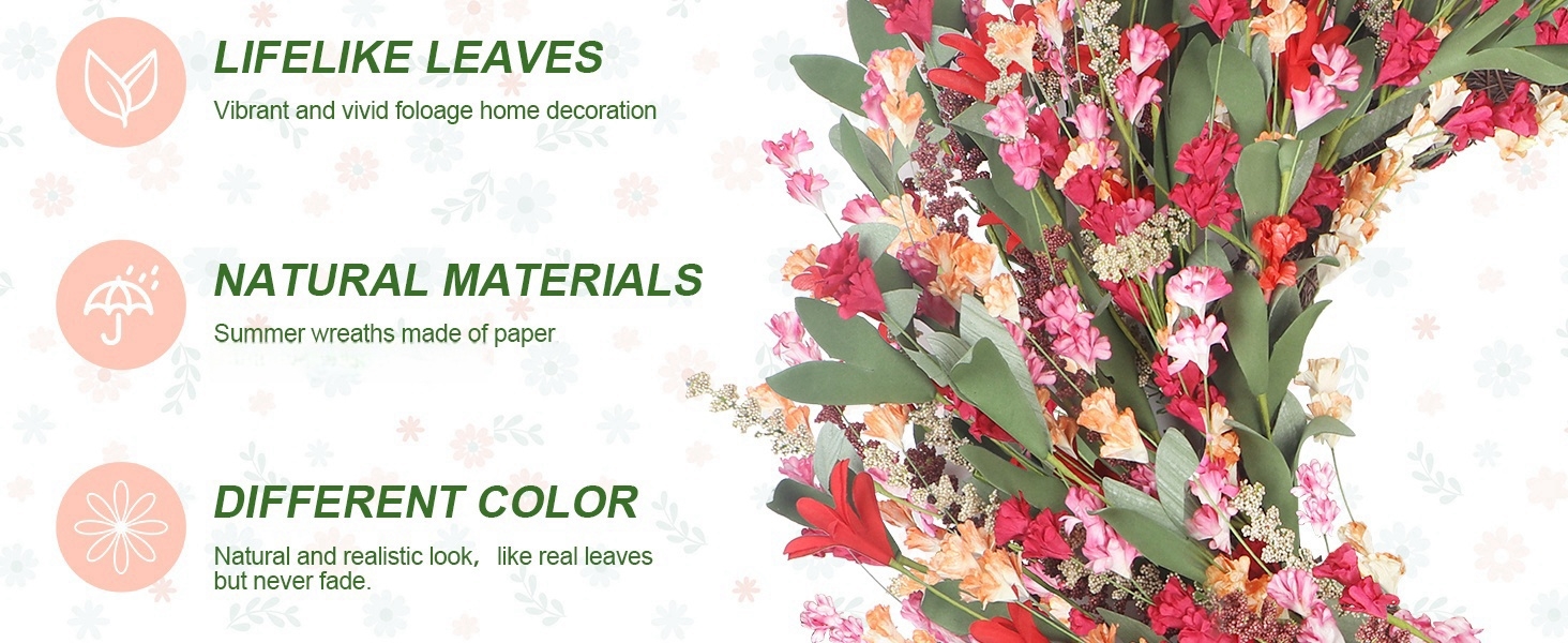 Choose High Quality Materials: our wreaths are made of the best quality materials, the bright paper flowers are hand-dyed, unique dyeing technology makes the wreaths not easy to fade, the hand-cut EVA leaves feel real to the touch, the flower spikes are full and lovely, the whole wreaths are beautiful and full of texture!