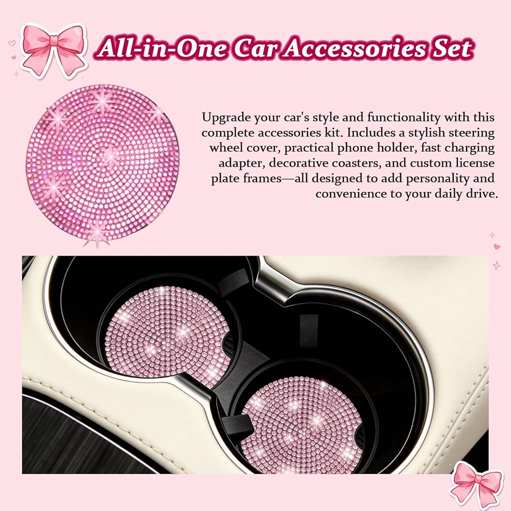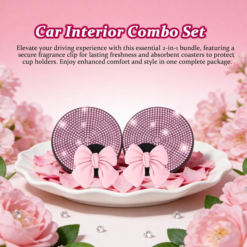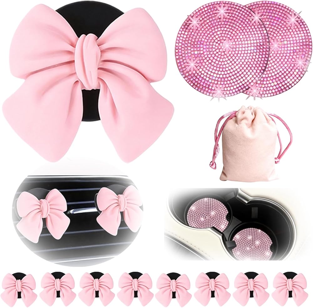 11pcs Pink Car Accessories Set, Air Vent Clips Car Accessories with 2pcs Car Cup Holder Coaster and 1 Storage Bag, Cute Car Decor for Women Girl Unique Pink Car Decor: Brighten your vehicle's interior with charming pink bling car accessories that bring a feminine touch and stylish vibe to your ride Easy-To-Use Vent Clips Car Accessories: Simply attach the car air freshener vent clip to any air vent for a fresh scent and a cute decorative accent Versatile Car Vent Clips Cute Design: These versatile pink bow car accessories for women fit most cars while adding an adorable and functional flair Freshen Any Space: Not limited to cars, these car air freshener cute clips can be used in offices or rooms to keep the air pleasant and visually appealing Multi-Function Car Cup Holder Coaster: Includes a coordinating pink car accessories for women coaster that protects your cup holder and complements the vent clip set perfectly