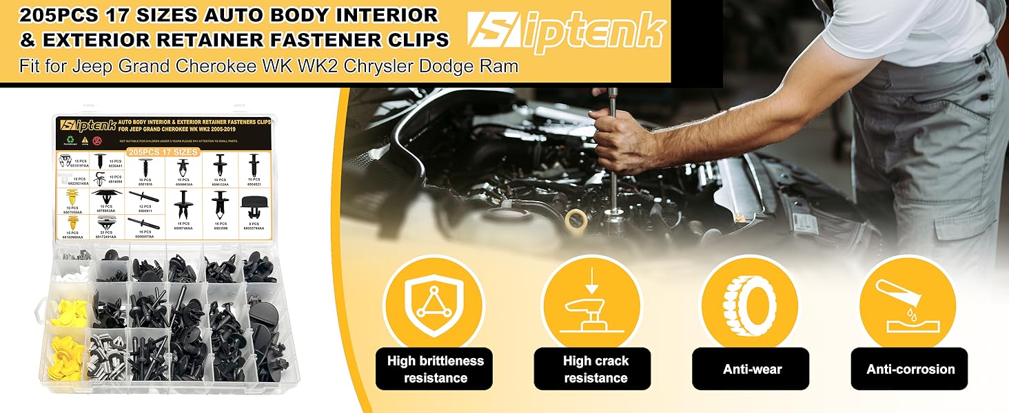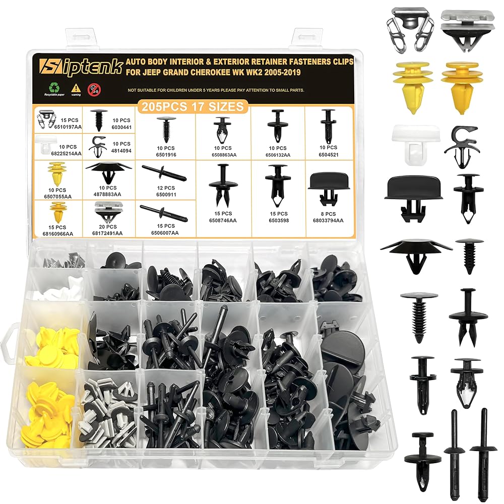 Siptenk 205PCS Car Retainer Clips Fasteners, 17 Popular Sizes Bumper Fender Door Panel Clips Auto Push Pin Rivets Set for Jeep Grand Cherokee WK WK2 Chrysler Dodge Ram