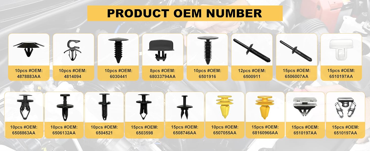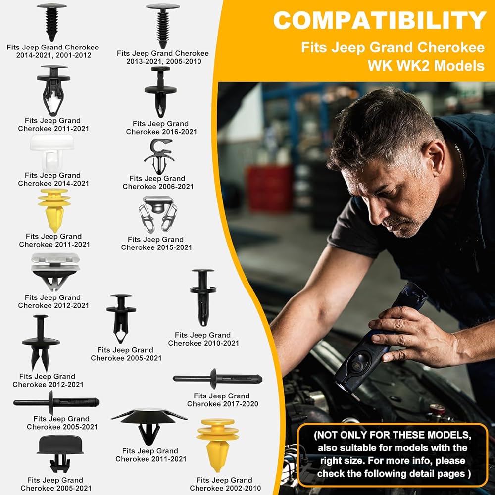 COMPATIBLE MODELS: These automotive body clips are suitable for Jeep Grand Cherokee WK, WK2, Chrysler, Dodge, Ram - for both body interior and exterior retainer fastener clip replacement. (They are also suitable for other models with the correct size. Please check the specific size chart.) This auto clips and fasteners kit is great for anyone who works on vehicles and needs to replace used or broken retainers.