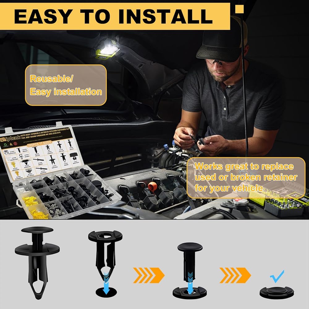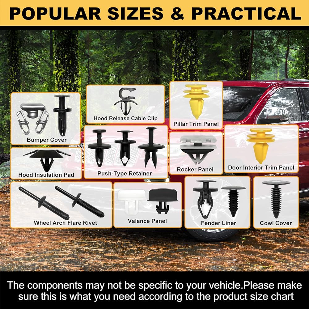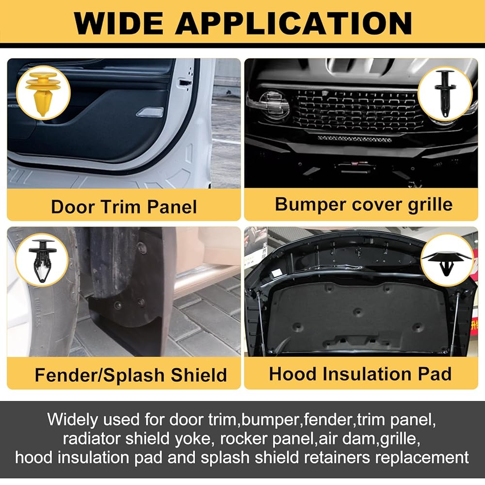 MULTI-APLLICATION: The car clips fasteners kit including bumper cover grille push-type retainer, bumper splash shield clip, bumper impact absorber nut, bumper cover rivet, radiator support splash shield clip, door interior trim panel clip, fender liner retainer, hood insulation pad clip, hood release cable clip, cowl cover clip, rocker panel molding clip, valance panel clip, air dam clip, push-type retainer, pillar trim panel clip, wheel arch flare / rocker panel molding rivet.