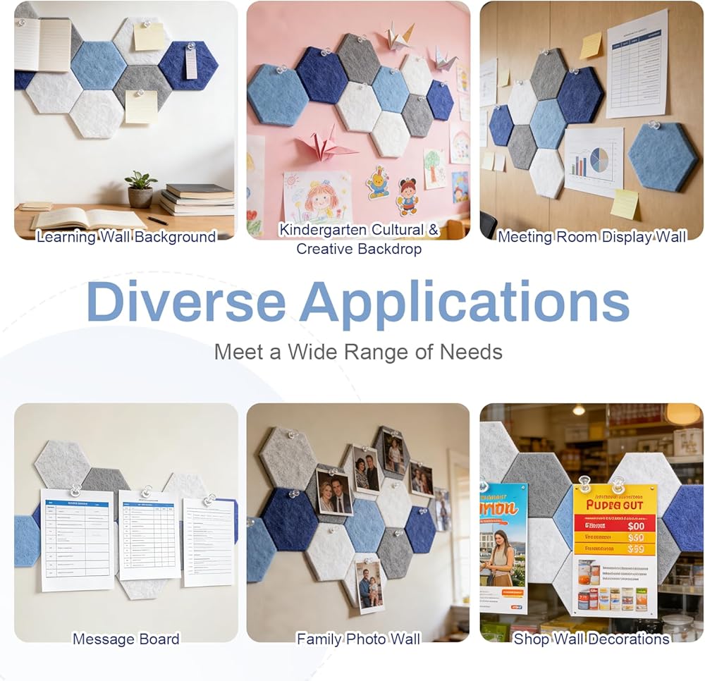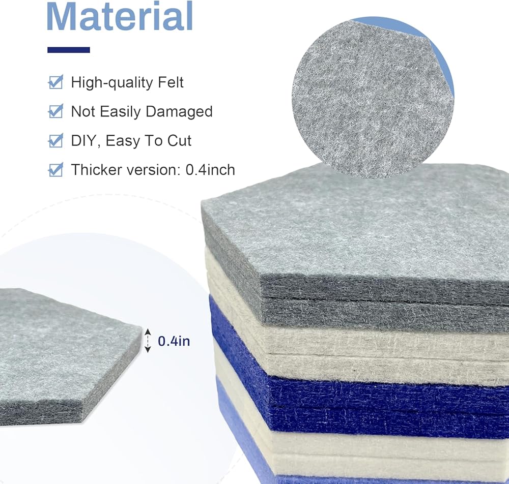 10-Pack Modern Hexagon Design: Set includes ten blue hexagonal fabric tiles (6" x 5.1" each) for flexible mounting. Freely combine the honeycomb shapes to create personalized wall decor that breaks away from traditional square bulletin boards.
