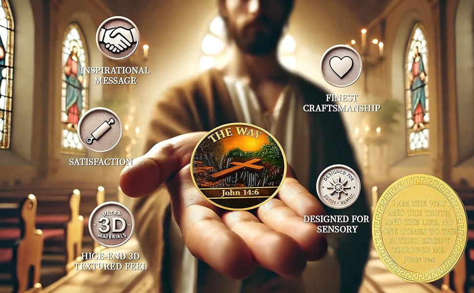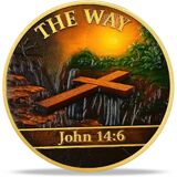 FRONT & BACK DESIGN: The front of the coin depicts a majestic cross at the end of a glowing path through a canyon, symbolizing the light of Christ guiding the way. The phrase "I AM THE WAY, THE TRUTH, AND THE LIFE" is displayed, representing Christ's promise. The back features John 14:6, "I am the way and the truth and the life. No one comes to the Father except through Me," providing a powerful reminder of the salvation found through faith in Christ.