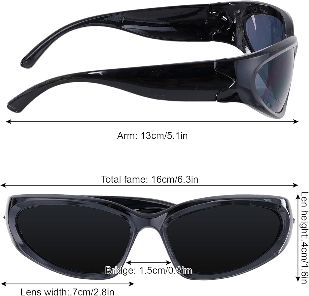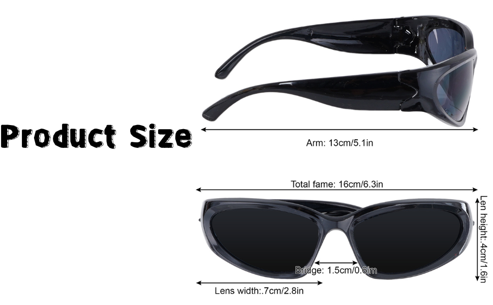 3-Pack Futuristic Y2K Wrap Around Sunglasses Set: Get three trendy pairs: Black Sunglasses (black frame/grey lens), Silver Sunglasses (silver frame/grey lens), and a Silver Frame/White Mirror Lens style.Total width 6.3", nose bridge 0.6", temple length 5.1", compact lens width 2.8", frame height 1.6"