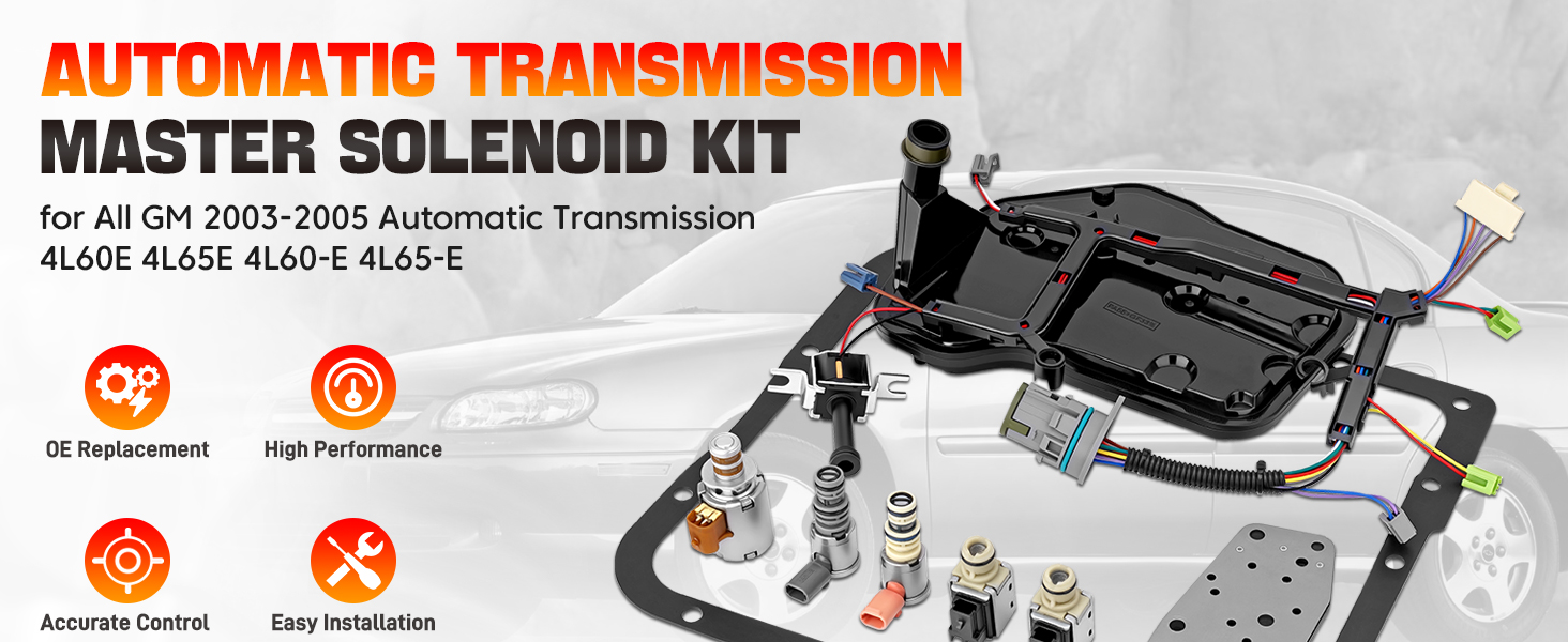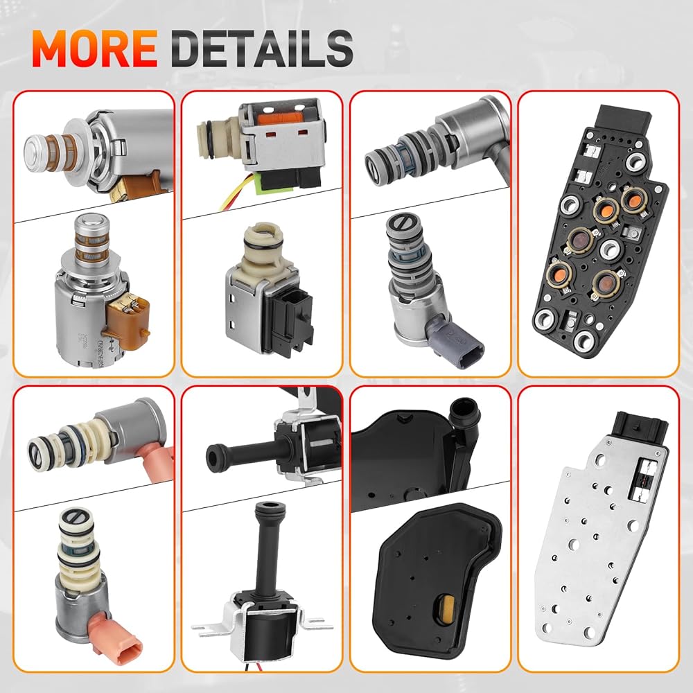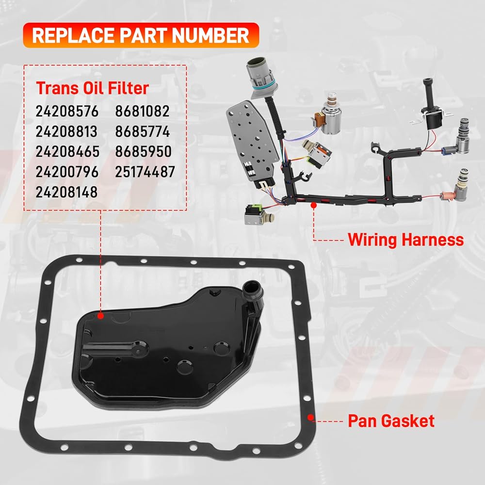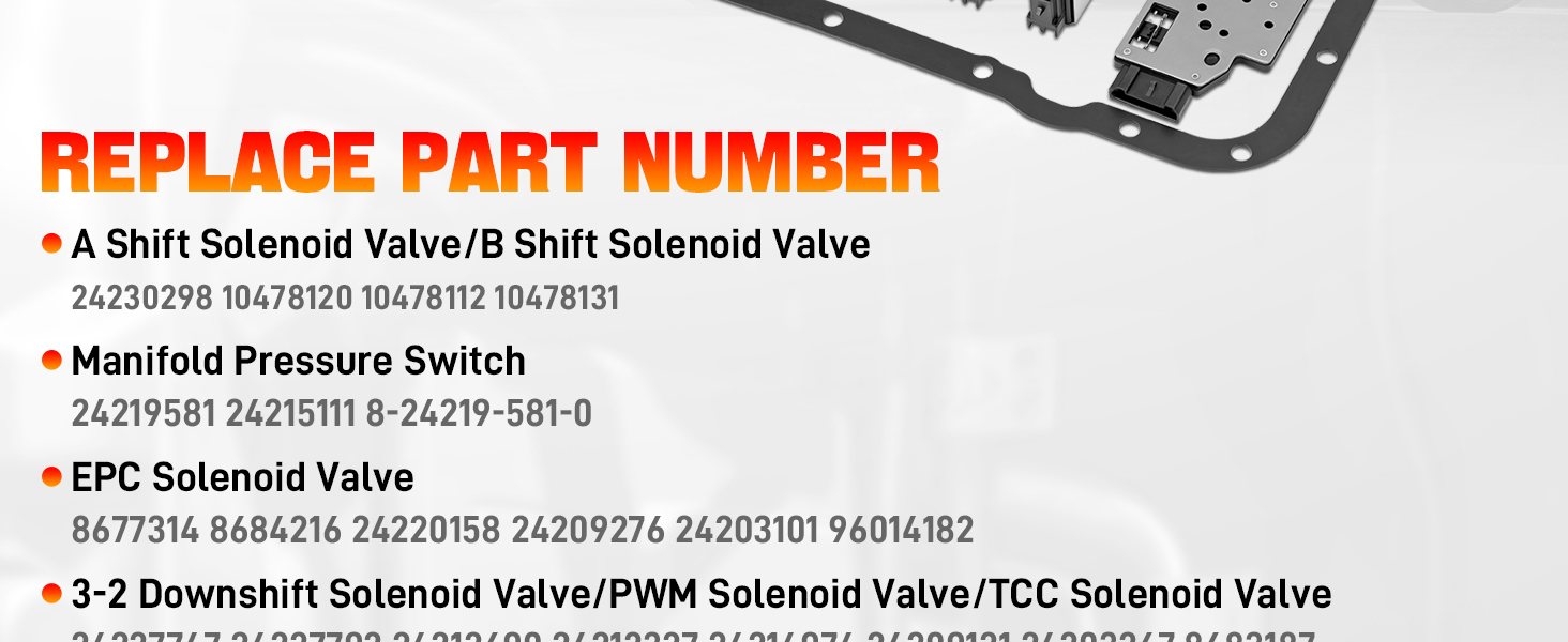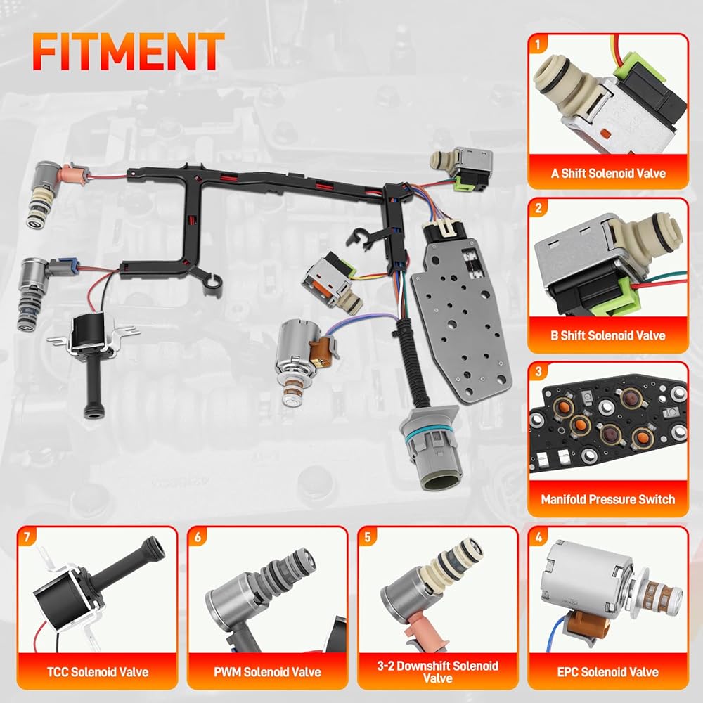 - 【PACKAGE INCLUDE】A-shift solenoid valve *1, B-shift solenoid valve *1, 3-2 downshift solenoid valve *1, EPC solenoid valve *1, PWM solenoid valve *1, manifold pressure switch *1, TCC solenoid valve *1, pan gasket *1, trans oil filter *1, wiring harness *1
