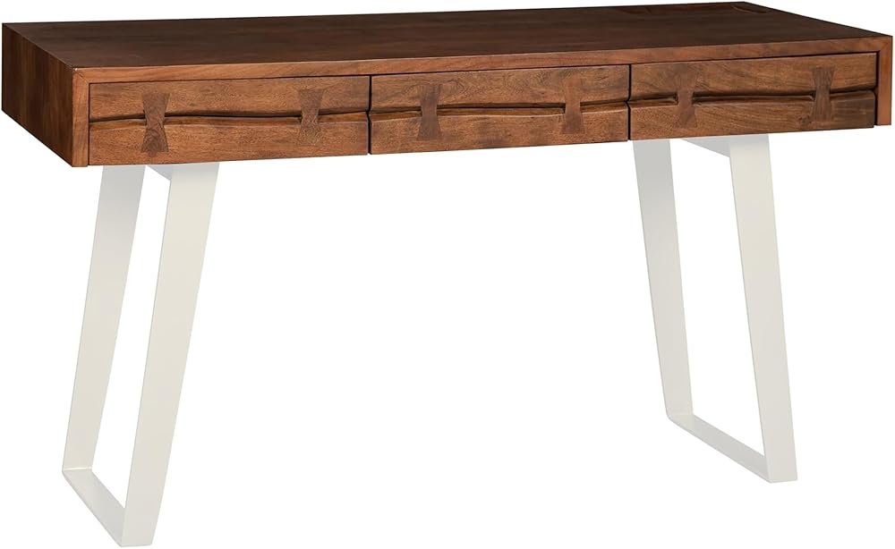 UNIQUE HANDLE DESIGN: Each of the three integrated drawers features an eye-catching cross-carved handle instead of traditional pulls. This creative element adds subtle charm and gives the desk top a sleek and minimalist appearance. The structure ensures the drawers blend seamlessly into the body of this stylish small desk.