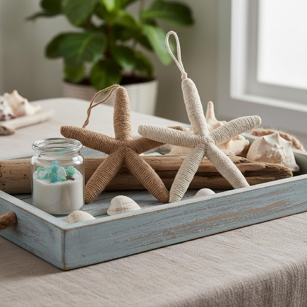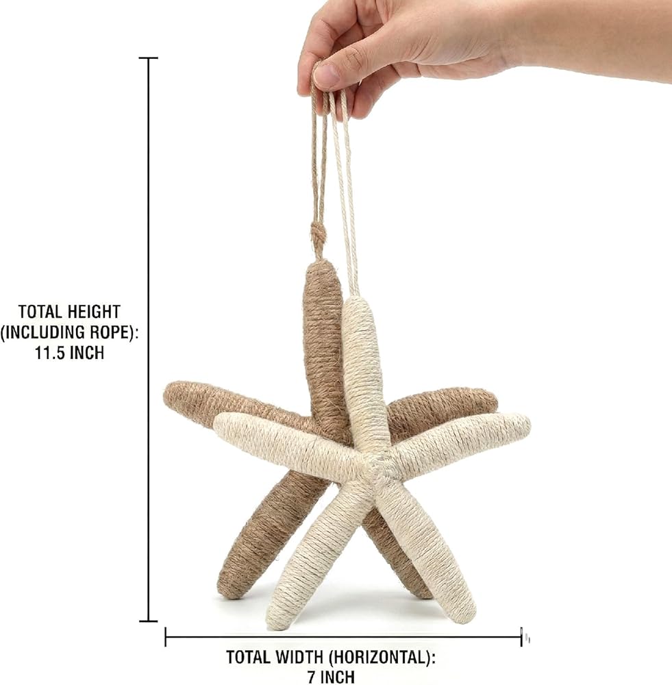 Rustic Rope Starfish Wall Hanging Decor, Set of 2 Nautical Coastal Jute Ornaments for Beach House, Bathroom, Door Handle, Wall Art, Handmade Sea Decorations Christmas Star Tree Topper
