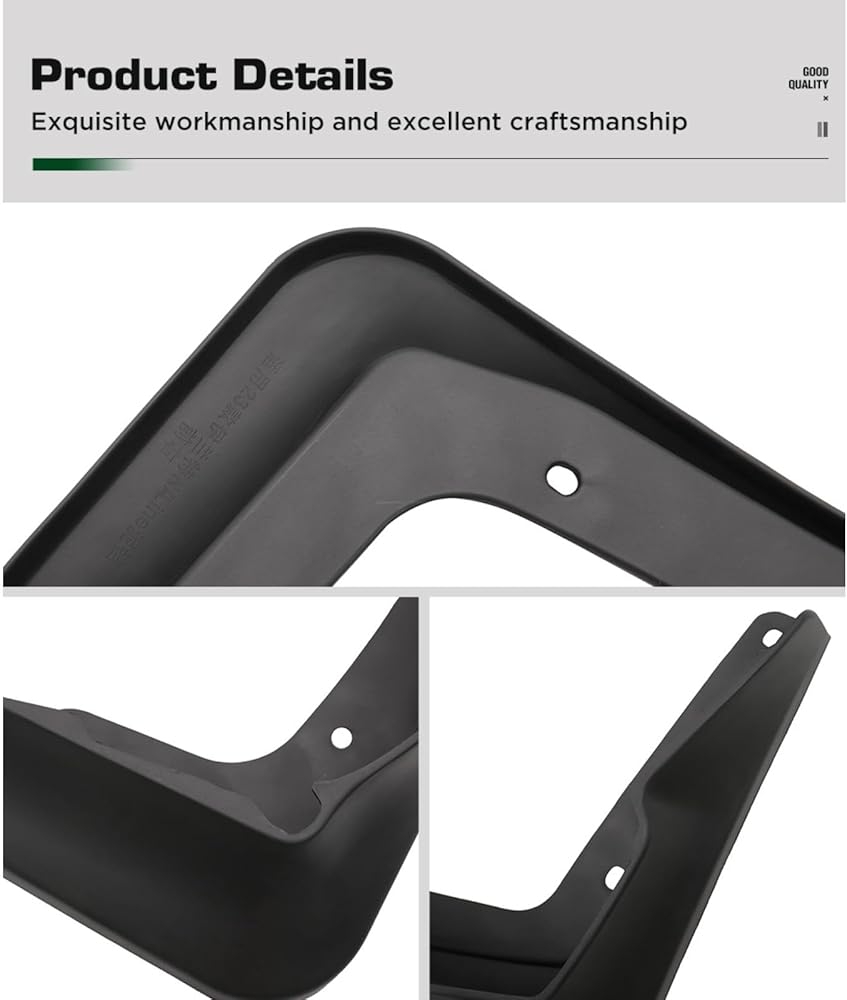 【Premium ABS Material】 Crafted from high-quality black ABS plastic, cold resistance, and aging resistance. It maintains shape and stability even under harsh conditions and impacts. The flexible edges absorb shocks and vibrations during driving, reducing wear and potential damage to the mud flap itself.