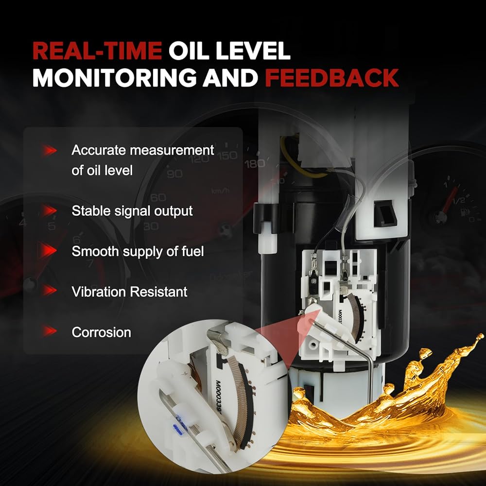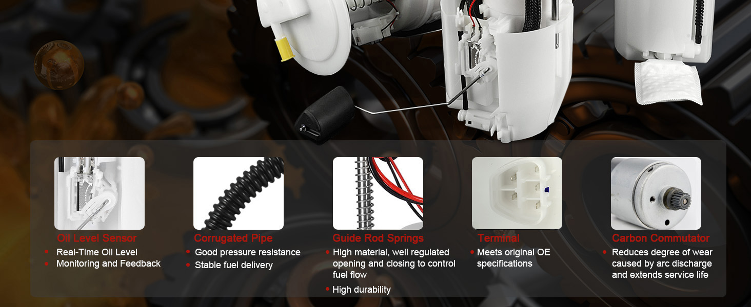KacuYelin electric fuel pump assembly: 1) pump core adopts carbon commutator, which reduces wear and tear of arc and has lubrication performance, thus improving service life; 2) scoop impeller optimizes suction efficiency and reduces noise; 3) oil leveler signal is stable,thus real-time monitoring and smooth oil supply, while built-in high mesh filter cloth filters oil impurities of certain size to ensure smooth engine operation