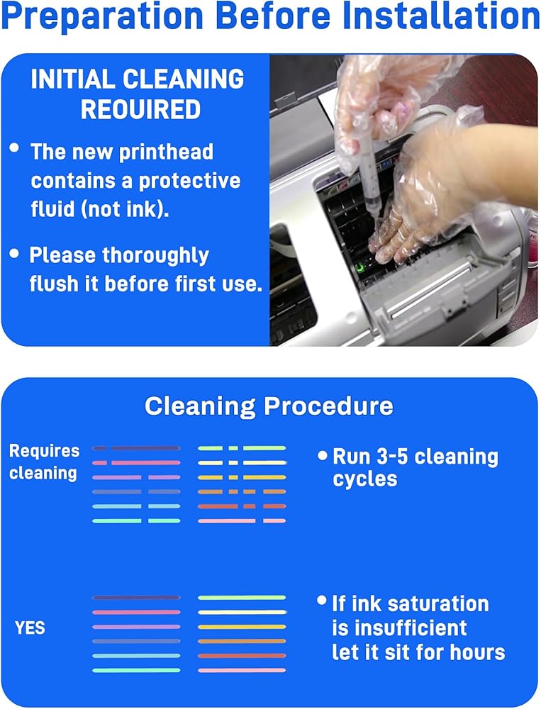 Pre-Installation Instructions:The new printhead contains a protective fluid (not ink). Thoroughly flush it before first use. Run 3-5 cleaning cycles. If ink saturation is incomplete, let it sit for several hours