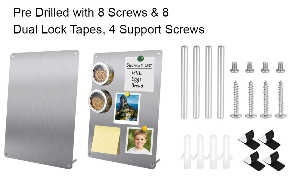 - PACKAGE CONTENTS: 2 x magnetic boards; 8 x screws; 8 x dual lock tapes; 4 x support screws (for tabletop display)