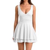 Features:Plunge V-neck, ruched waist, ruffled tiered hem, sleeveless design, fitted waist, flowy mini silhouette