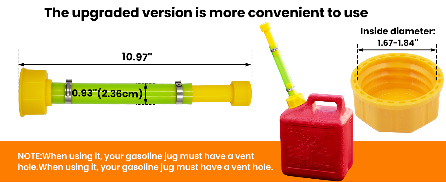 Compatible Gas Cans: The upgraded gas can spout is compatible with most 1/2/5/10 gallon gaoline cans. Fuel jug mouth sizes from 1.7in-1.82in both can be used. The total length of the spout is 10.9''. Please measure your gas cans mouth size before purchasing
