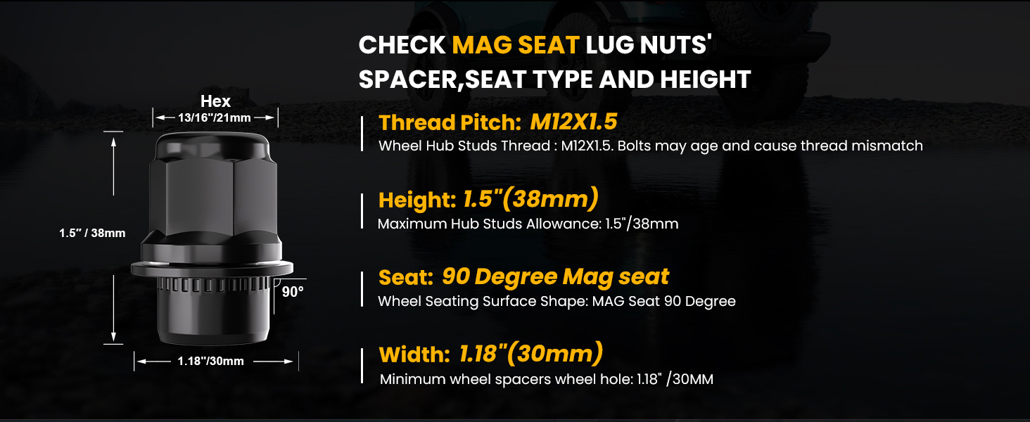 Fitment - This set of nuts is SHORT/SMALL mag Lug Nut. Only fit for wheels with studs M12x1.5 and flat seat Lug Nuts. Please confirm compatibility with your vehicle before purchasing.