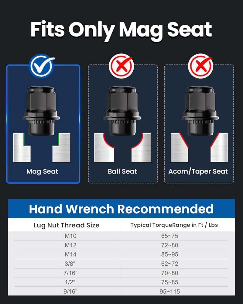 Benefits - Set of 4 13/16 hex mag Seat Lug Nuts. Can quickly improve the appearance of your vehicle. Mag Seat ensures perfect match with vehicle bolts.