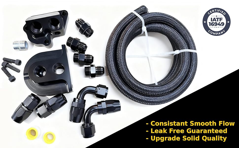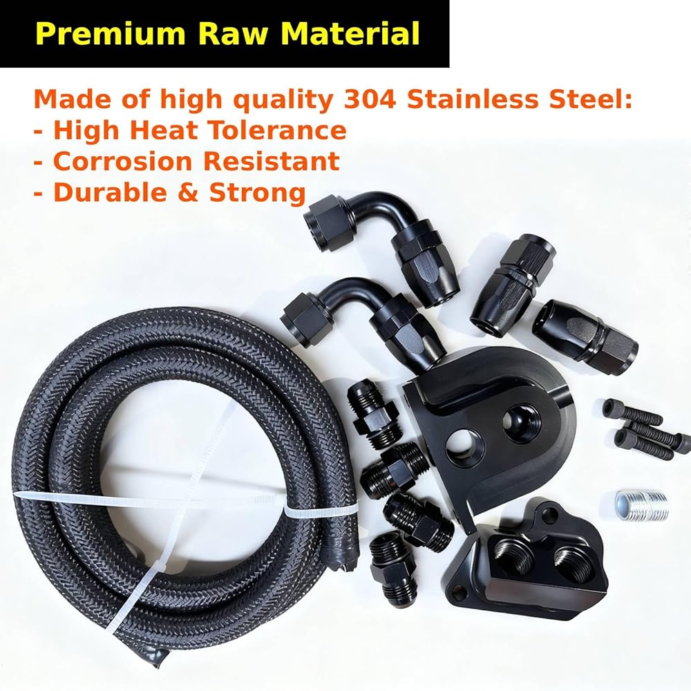 【Package Included】: 2 x 90 degree fittings; 2 x straight fittings; 1 x Oil filter mounting bracket and hardware.; 10AN fittings and oil pressure NPT fittings; 6 feet of stainless steel braided lines; 1 x Block adapter; 1 x Hardware bolts; 2 x free seal tapes.