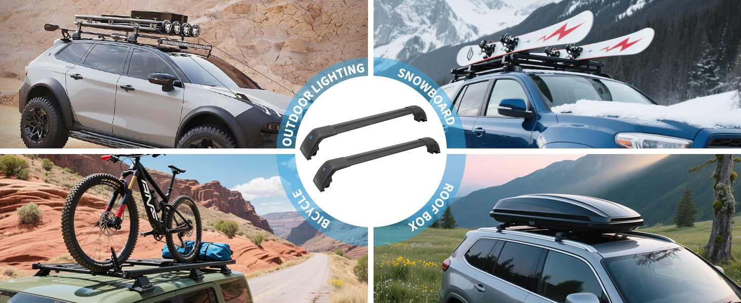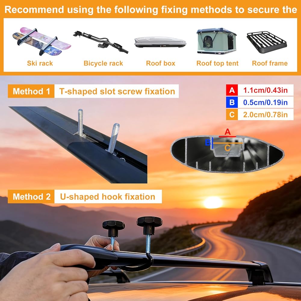 【MULTIPLE FUNCTIONE】High strength roof rack cross bar with anti-theft lock system. Low profile & streamline design makes it effective in reducing the wind noise when driving on a high speed, cross rails for roof rack can work with any roof accessories like cargo basket carrier, snowboard/bike rack, luggage box, kayak mount etc