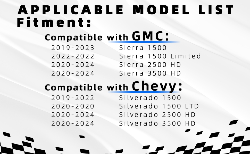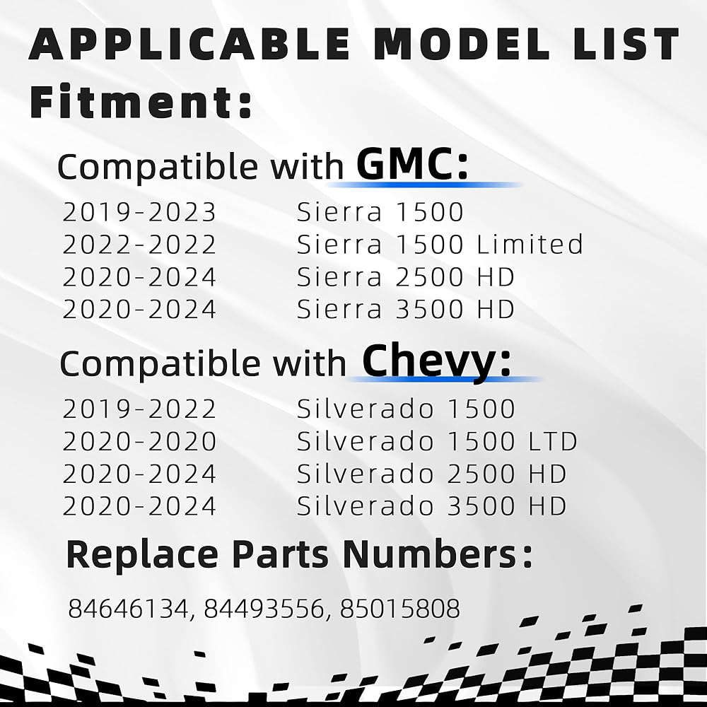 Fitment: Compatible with GMC: 2019-2023 Sierra 1500, 2022 Sierra 1500 Limited, 2020-2024 Sierra 2500 HD/3500 HD; Compatible with Chevy: 2019-2022 Silverado 1500, 2020 Silverado 1500 LTD, 2020-2024 Silverado 2500 HD/3500 HD