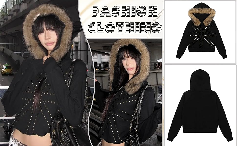 Stylish & Edgy Design: Elevate your streetwear look with this Y2K hoodie featuring edgy stud decorations and a chic faux fur-lined hood. This trendy jacket for women combines punk aesthetics with retro vibes, perfect for creating a standout gothic black hoodie or dark academia outfit.