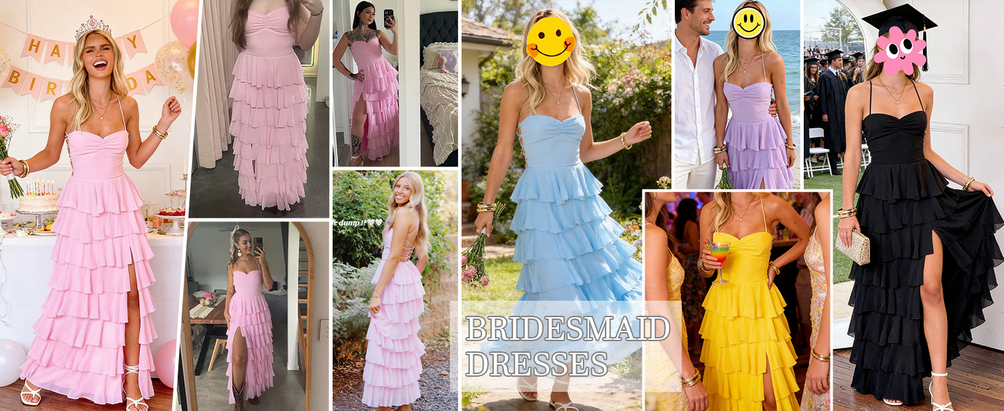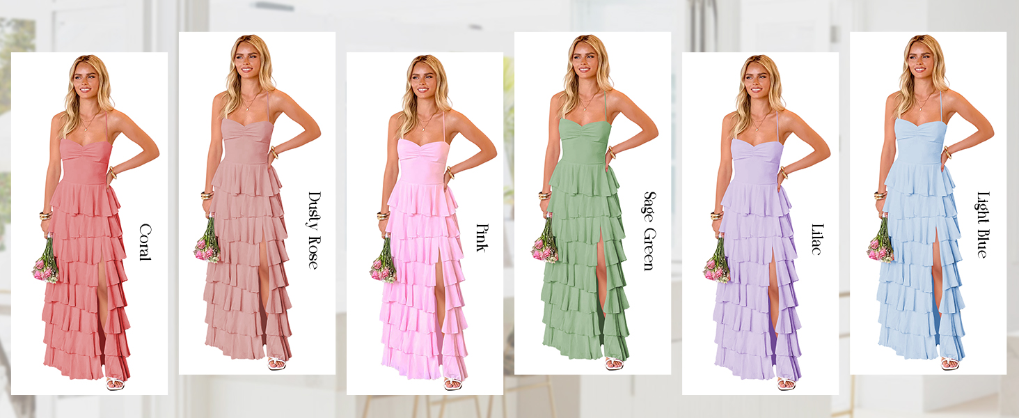 Design: Tiered ruffles bridesmaid dresses for wedding; Flowy chiffon bridesmaid dresses for women; Spaghetti straps prom dresses for women; A line jewel tone Maxi prom dresses for teens; Corset; Floor length; Empire Waist; Side Slit; Lace up Back