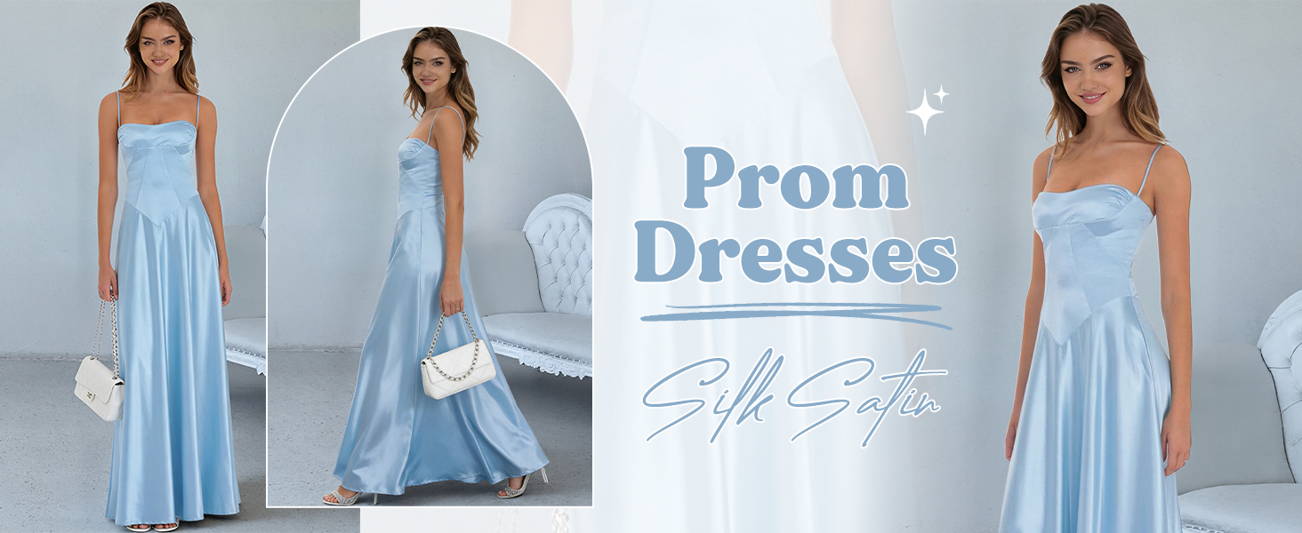 Feature:Satin Prom Dresses for Women, Long Spaghetti Straps Bridesmaid Dresses for Wedding, A Line Corset Formal Evening Gowns, Flowy Wedding Guest Dresses