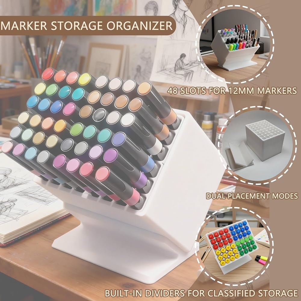 1.48 Slots for 12mm Markers & Multi-Tool Storage This Marker Storage Organizer features 48 precisely sized slots designed for 12mm diameter markers, perfectly fitting acrylic paint markers, art markers and standard pens. It also works as a pen storage rack for gel pens, highlighters and paint brushes, meeting all your art and office tool storage needs in one compact unit.