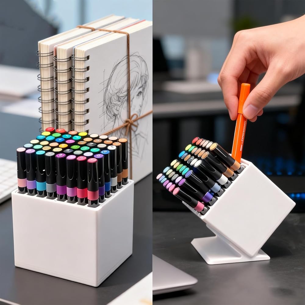 Keep your art markers, paint pens and fine writing tools neat, accessible and damage-free with our practical Marker Storage Organizer—your perfect solution for cluttered artist desks, craft stations, home offices and classroom tables! This thoughtfully designed marker organizer features 48 precisely sized slots tailored for 12mm diameter markers, offering ample storage for your markers and other standard-sized pens.Choose two convenient placement ways to fit your space and usage habits: stand it independently upright for space-saving desktop storage, or place it at a 45° angle for quick visual selection and easy grabbing.