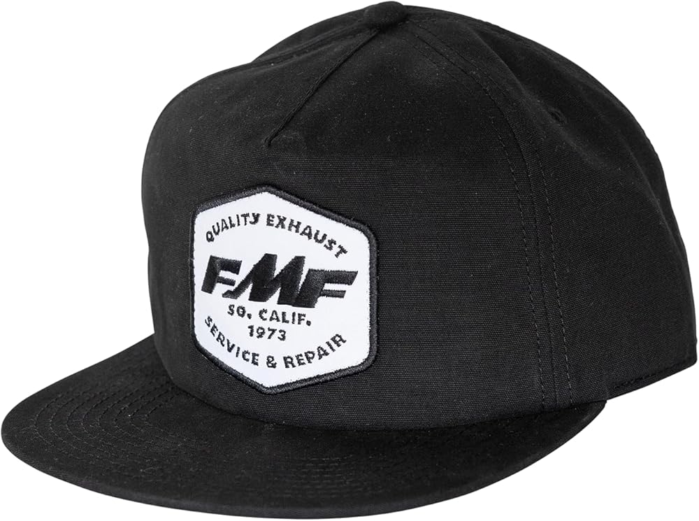 Snapback cap with 5 panels, featuring a custom FMF patch on the front and an FMF woven label at the snap closure.