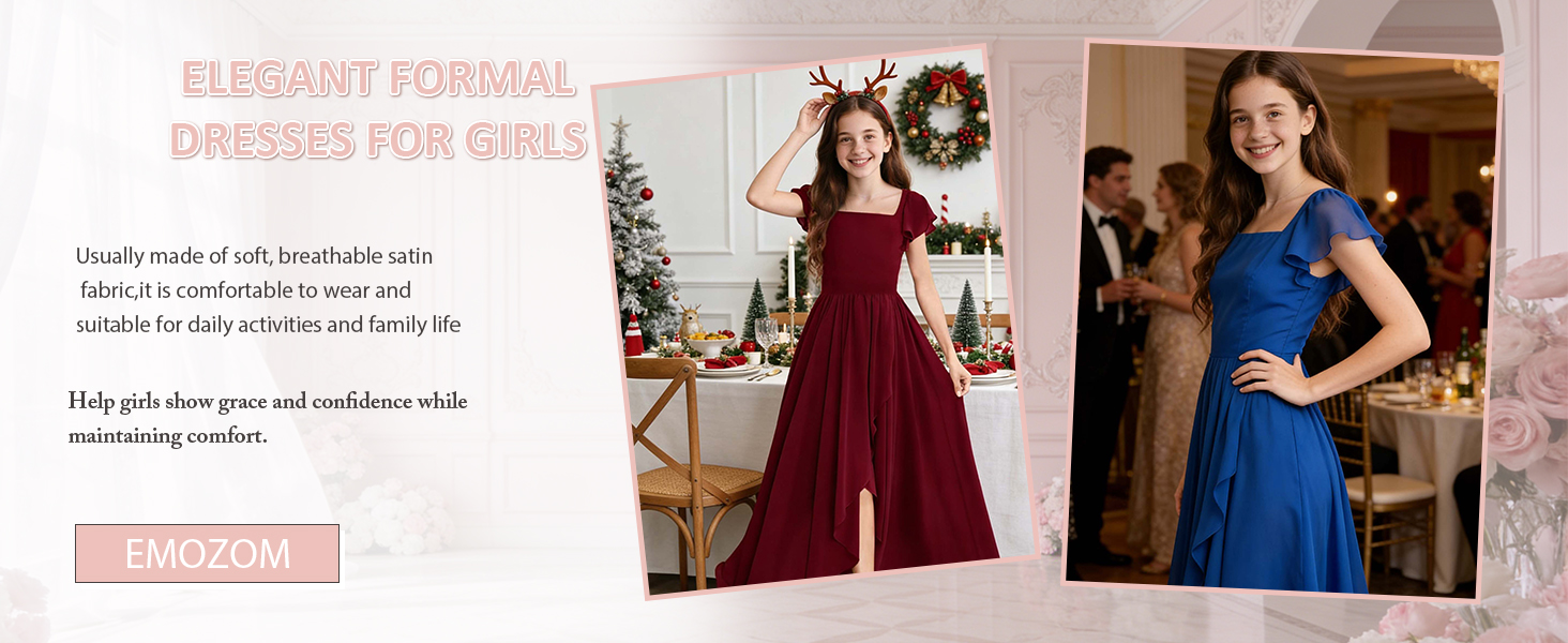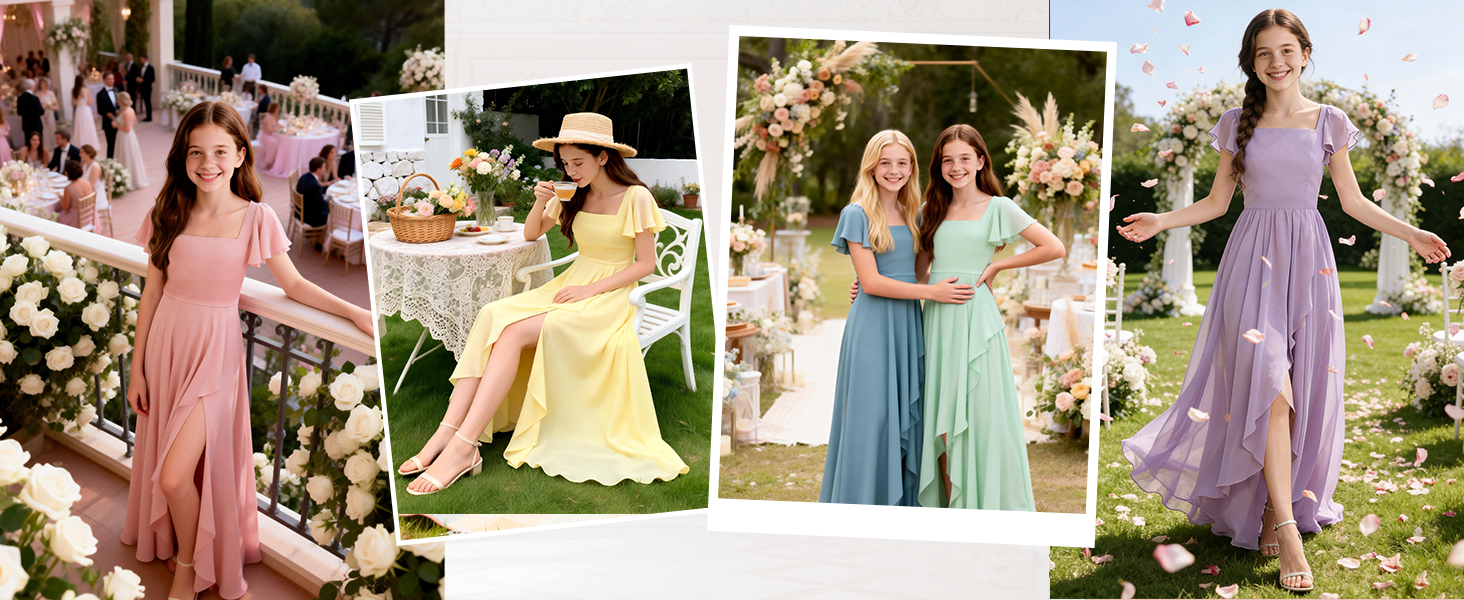 Exquisite design for little bridesmaid dress:A line floor length girls wedding dress,High-waisted design,Square neck girls prom bridesmaid dress, Flutter cap sleeves flower girl dress,The jr bridesmaid dress has 2 layers, so don't worry about see-through.This prom dress for little girls can show the elegant figure of a girl