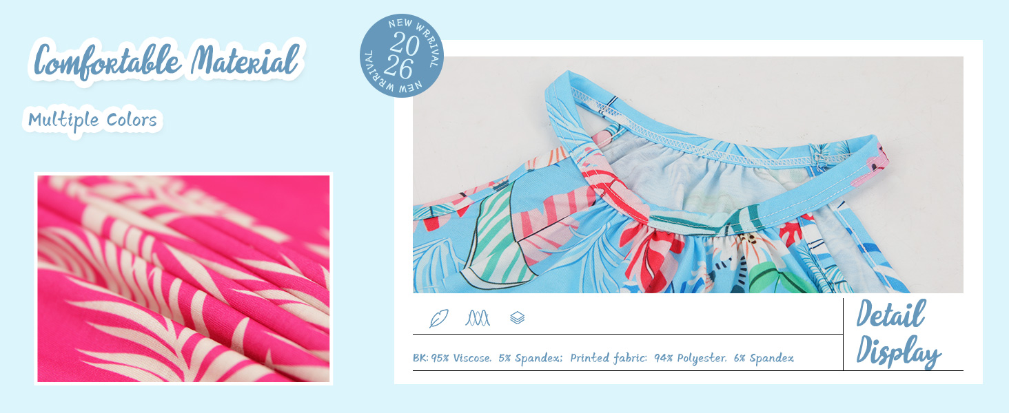 - Fabric composition: Black fabric BK:95% Viscose, 5% Spandex; Printed fabric: 94% Polyester, 6% Spandex — high-quality blends for durability and recovery.