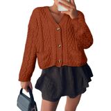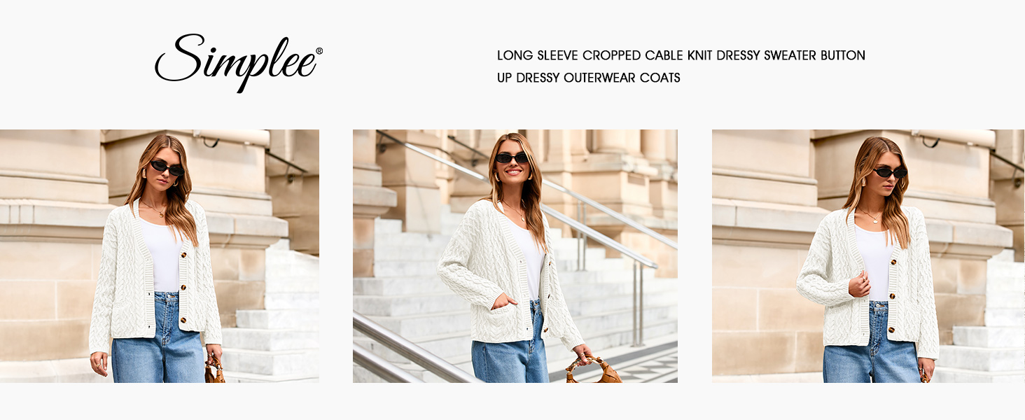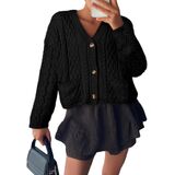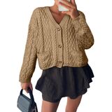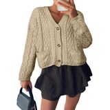 Fashion Design: Long sleeve, v neck, cable knit pattern, open front, button closure, two front pockets, casual short cardigan for women.
