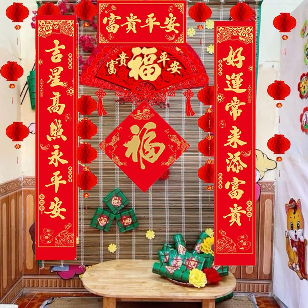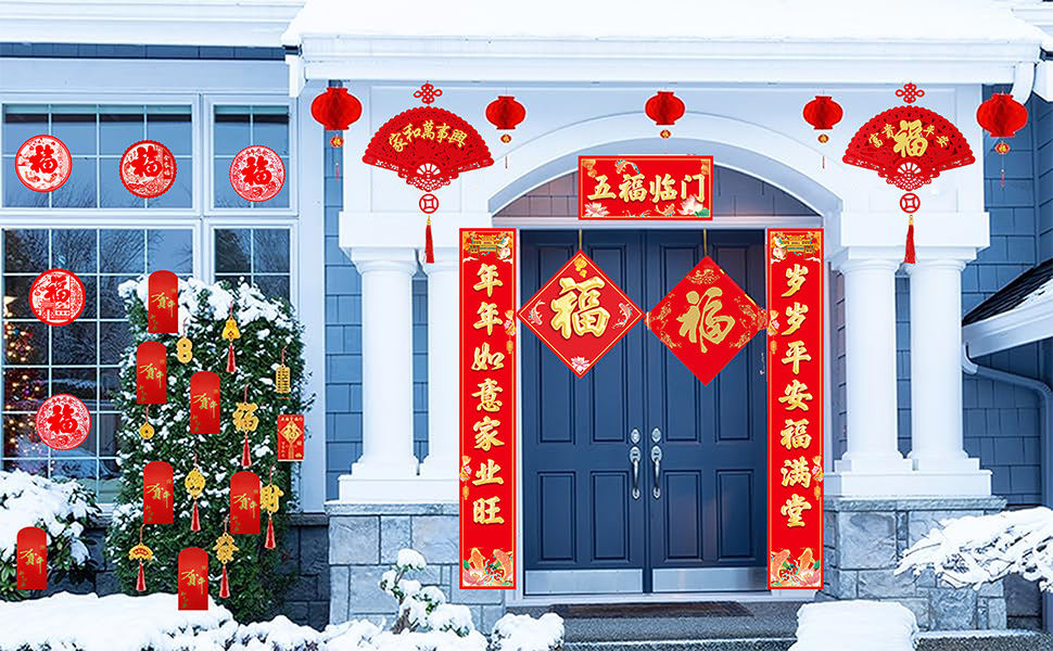 Lunar New Year Decoration Set including 2 Sets of spring festival couplets + 2PCS Flocked 3D Fan-Shaped+ 14PCS window stickers + 10 PCS Hangings + 2pcs Fu word sticker + 12CS Red Envelopes+ 10PCS paper lanterns.