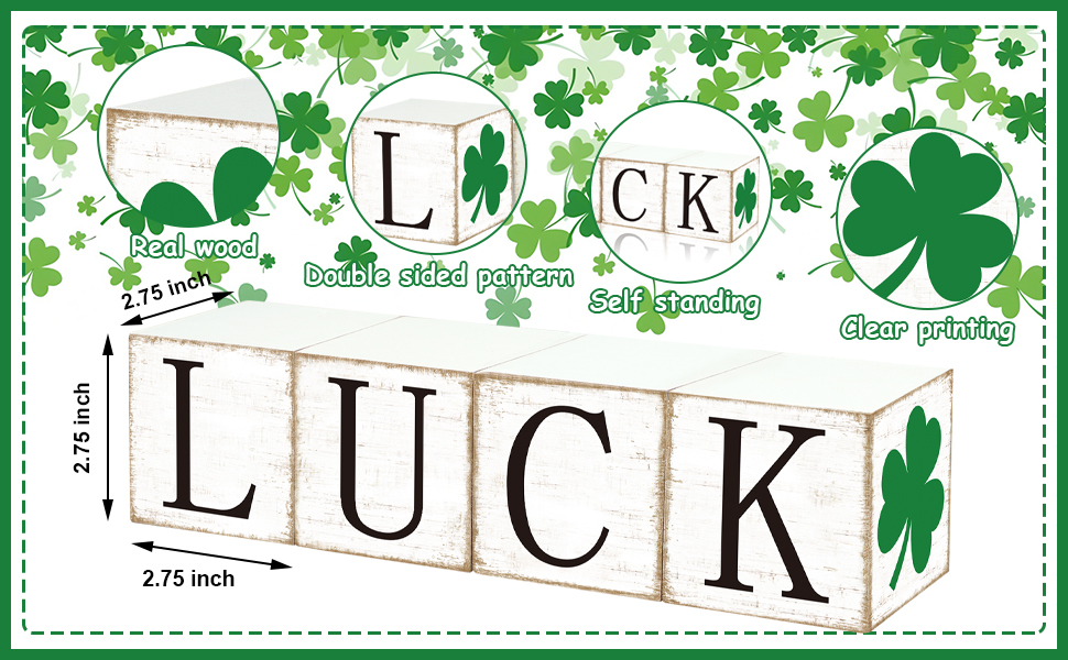 Double-sided design: the shamrock luck wood block sign features a unique double sided design, one side is printed with green clover and the other side is printed with the letters “luck”, elegant and charming, the double sided shamrock decor will make your table centerpiece more eye-catching.