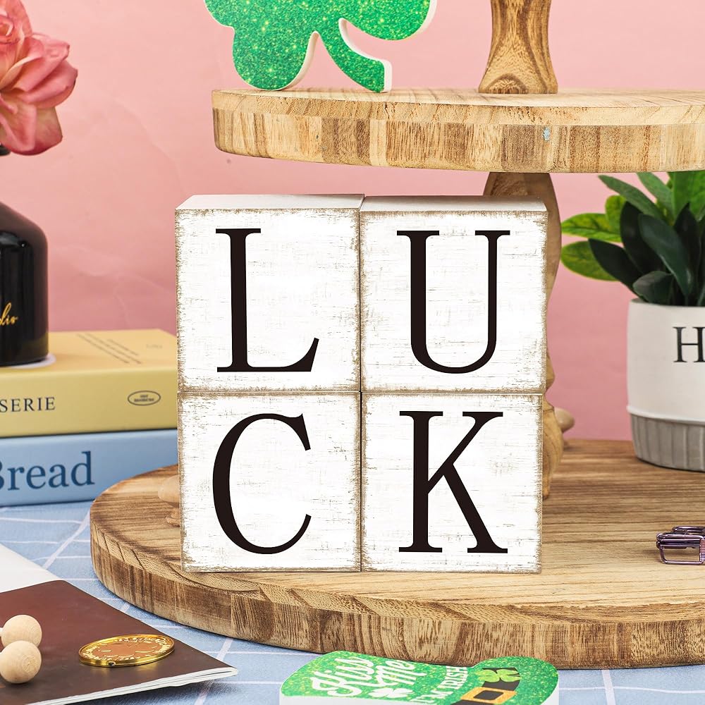 4 Pcs St. Patrick's Day Wooden Block Signs Double-Sided Shamrock Luck Tabletop Centerpiece Rustic Irish Clover Tiered Tray Decor for St. Patrick's Day Holiday Party Home Office Shelf Table Decoration