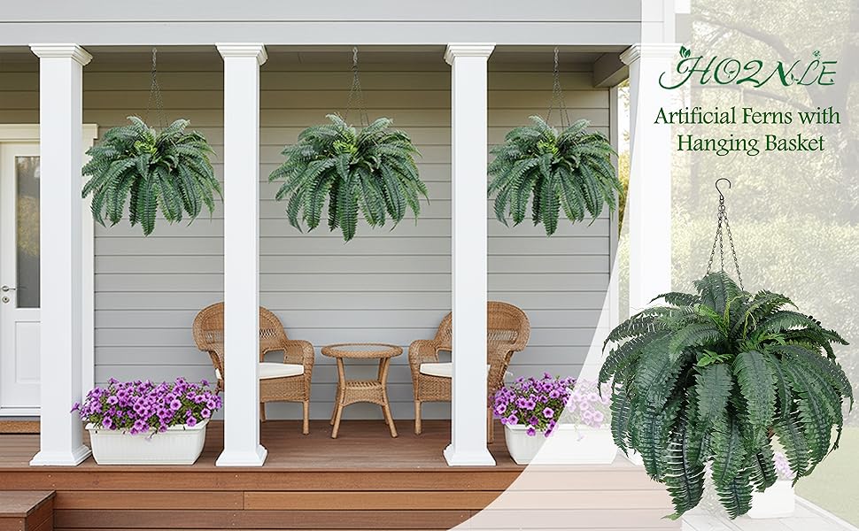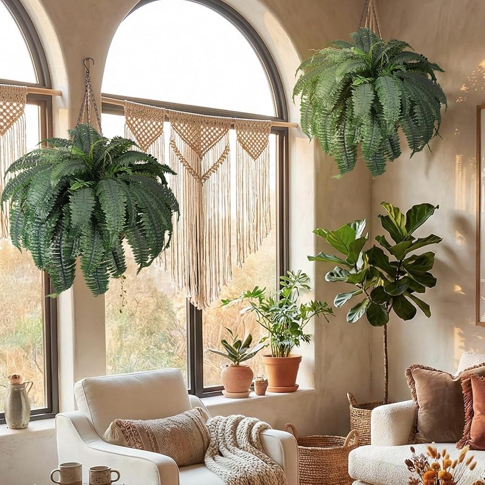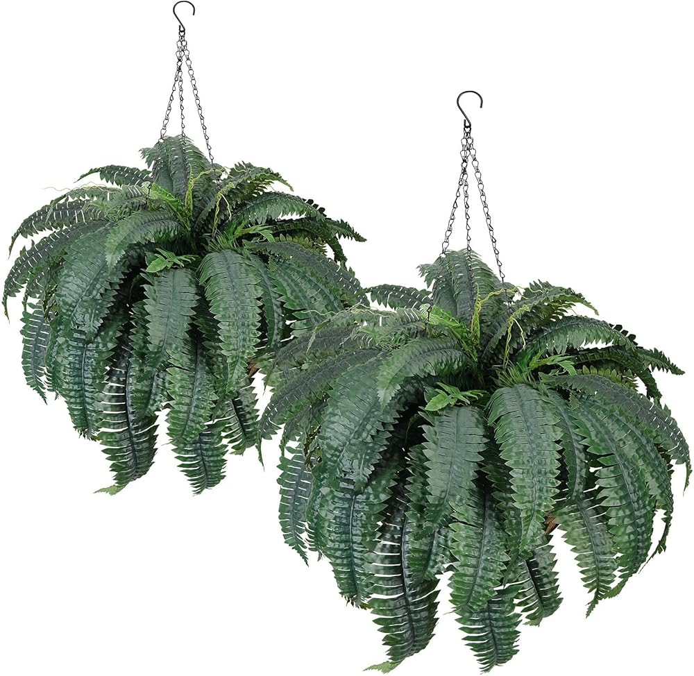 [Package]:The set includes 2 faux ferns with pre-assembled hanging baskets for instant installation—ideal as faux hanging plants.