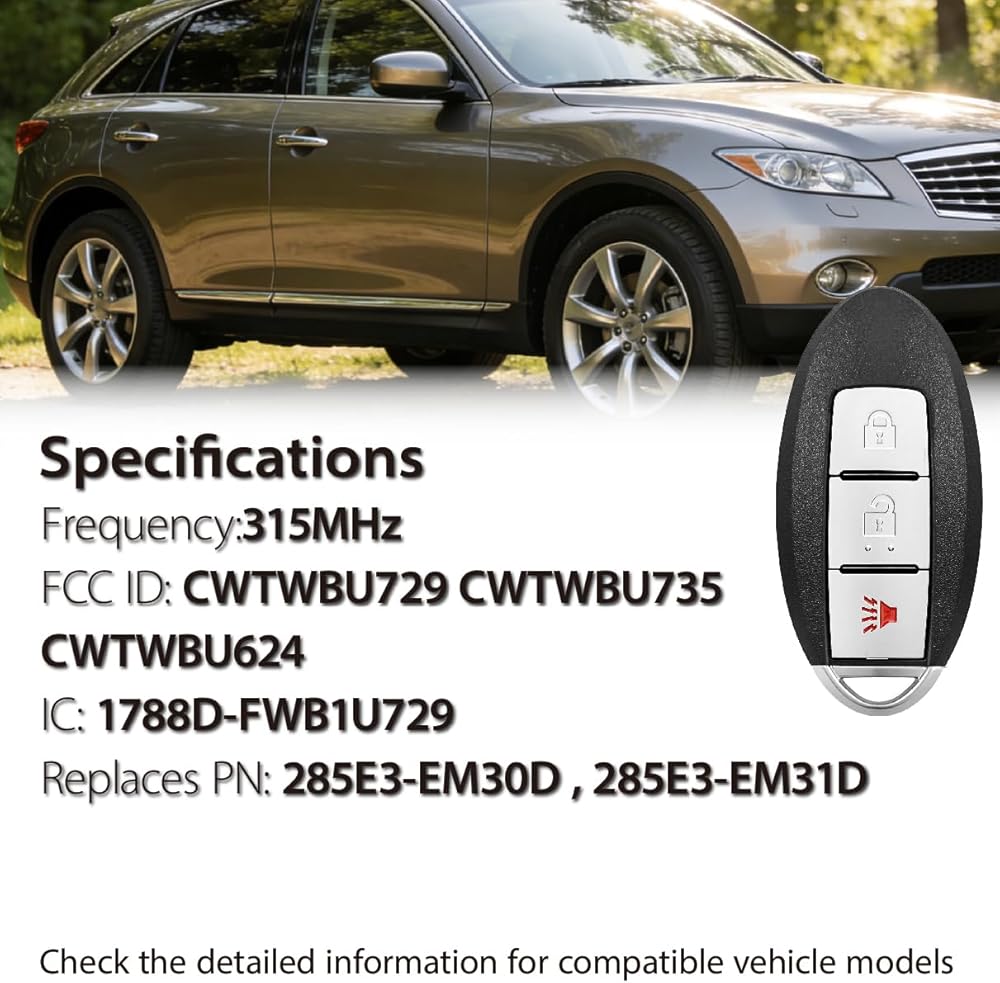 • 1 Keyless Entry Remote: Part Number:285E3-EM30D,FCC ID:CWTWBU729, fits for 2007 - 2013 Nissan.For full complete list, please check our product description