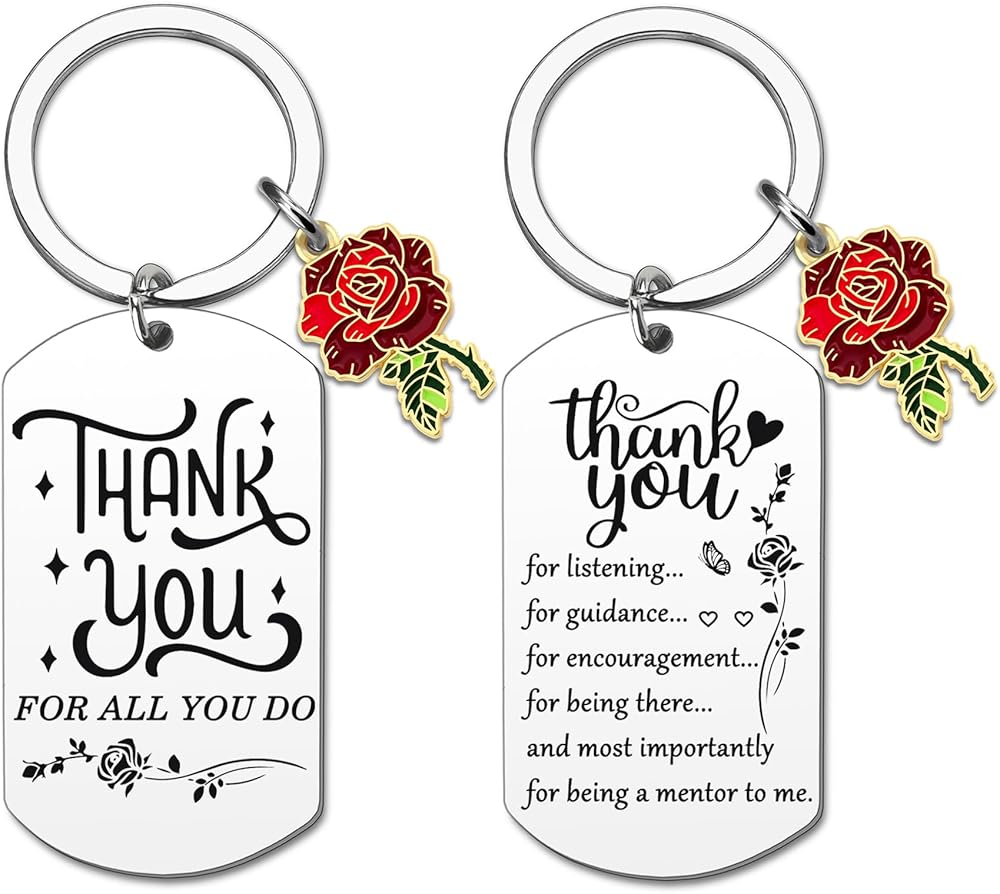 This double sided keychain is very emotional.On one side, it has "THANK YOU FOR ALL YOU DO" with decorative elements on some letters and a rose design below.On the other side, "thank you" is followed by a message expressing gratitude for listening, guidance, encouragement, presence, and being a mentor. There is also a rose and a butterfly design.It's a touching gift for someone important.