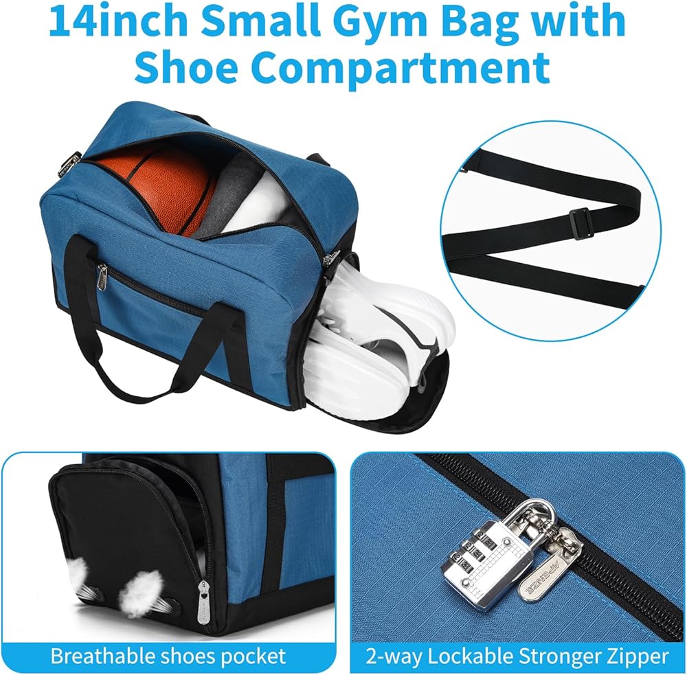 DESIGNED GYM BAG: This small gym bag is designed for gym. Its' 14" size fits perfectly for gym locker. It can hold a pair of shoes, change clothes, water bottle, and other essentials for gym.