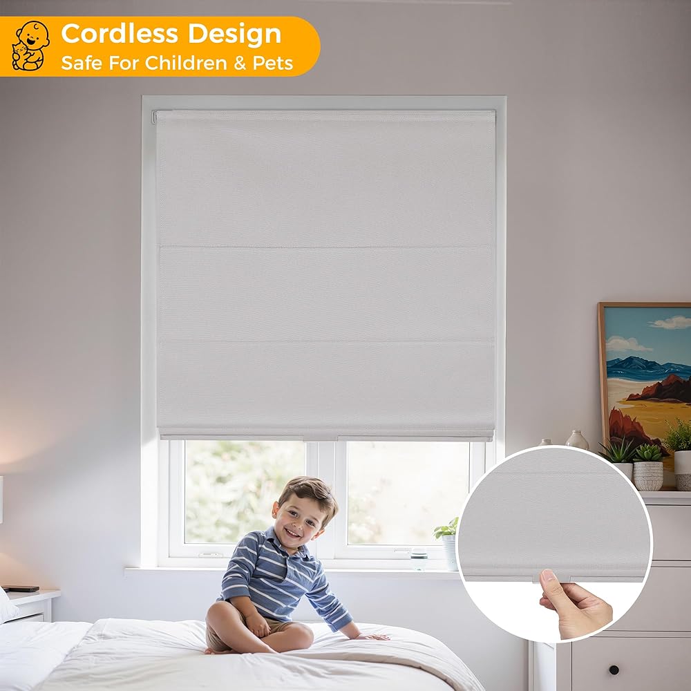 【Cordless Design, Child Safety】: Unlike traditional beaded roller shades, our product features a cordless operating system. The smooth spring-loaded mechanism allows easy height adjustment and stays in place wherever you stop. This design eliminates the risk of strangulation for children and pets, creating a safer and more comfortable living environment.