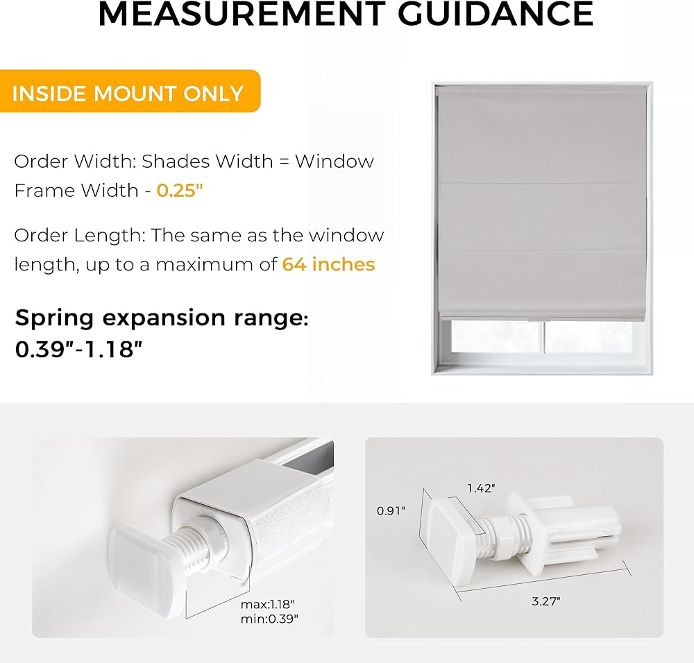【Inside Mount Only】: For optimal installation results, please subtract 0.25–0.5" from the actual window width when measuring. This ensures a secure fit within the window frame. Order length = window height, with a maximum available length of 64". (Please note: window frame depth must be greater than 1.82".)