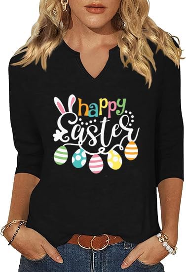 • Features: Body type: Regular, Length: Regular, Thickness: Thin, Sleeve: 3/4 Sleeve, Collar: V Neck. 3/4 Sleeve Shirts for Women Easter Graphic Shirts.