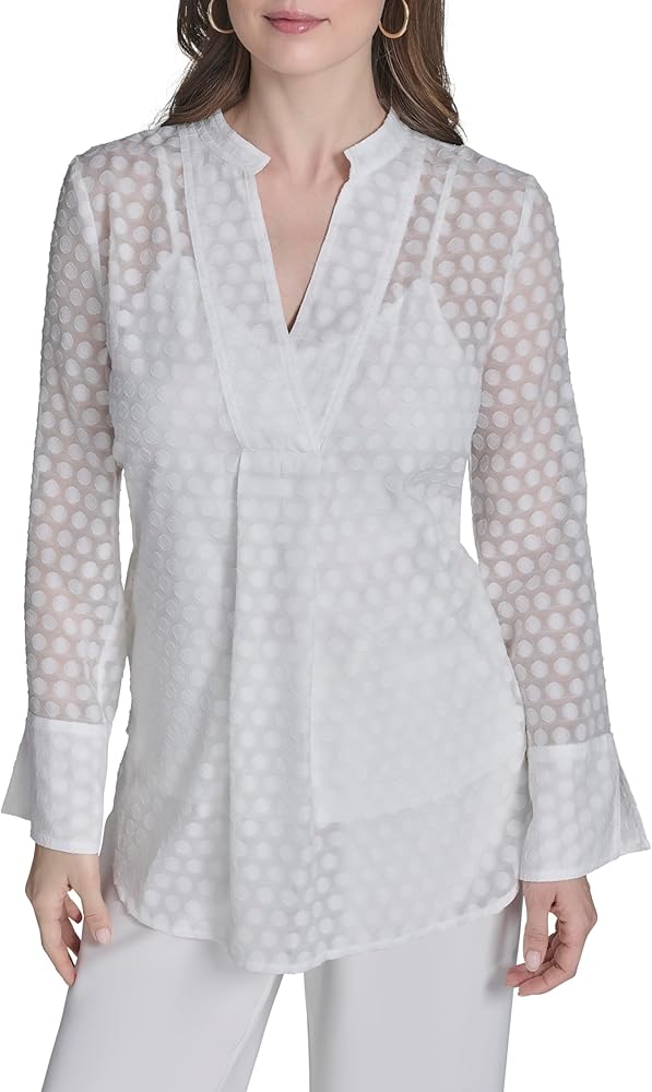 This Halston Women's Sportswear Top is a Long Sleeve V-Neck Dotted Chiffon Loose Fit Blouse