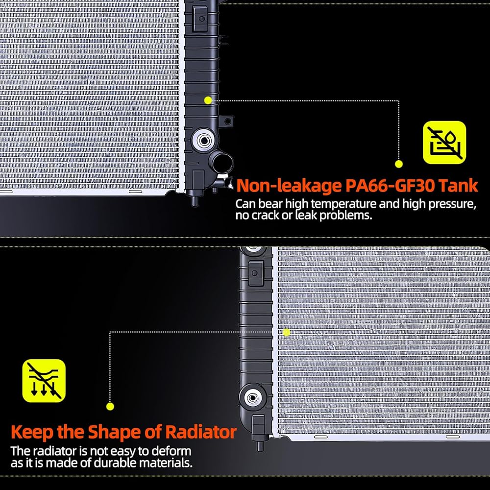 【DURABLE & LEAK-PROOF CONSTRUCTION】 Built to last with a TIG-welded aluminum core and corrosion-resistant PA66 GF30 plastic tanks. Includes integrated engine and transmission oil coolers. Every unit undergoes 100% rigorous leak testing and quality control to guarantee longevity and reliability.
