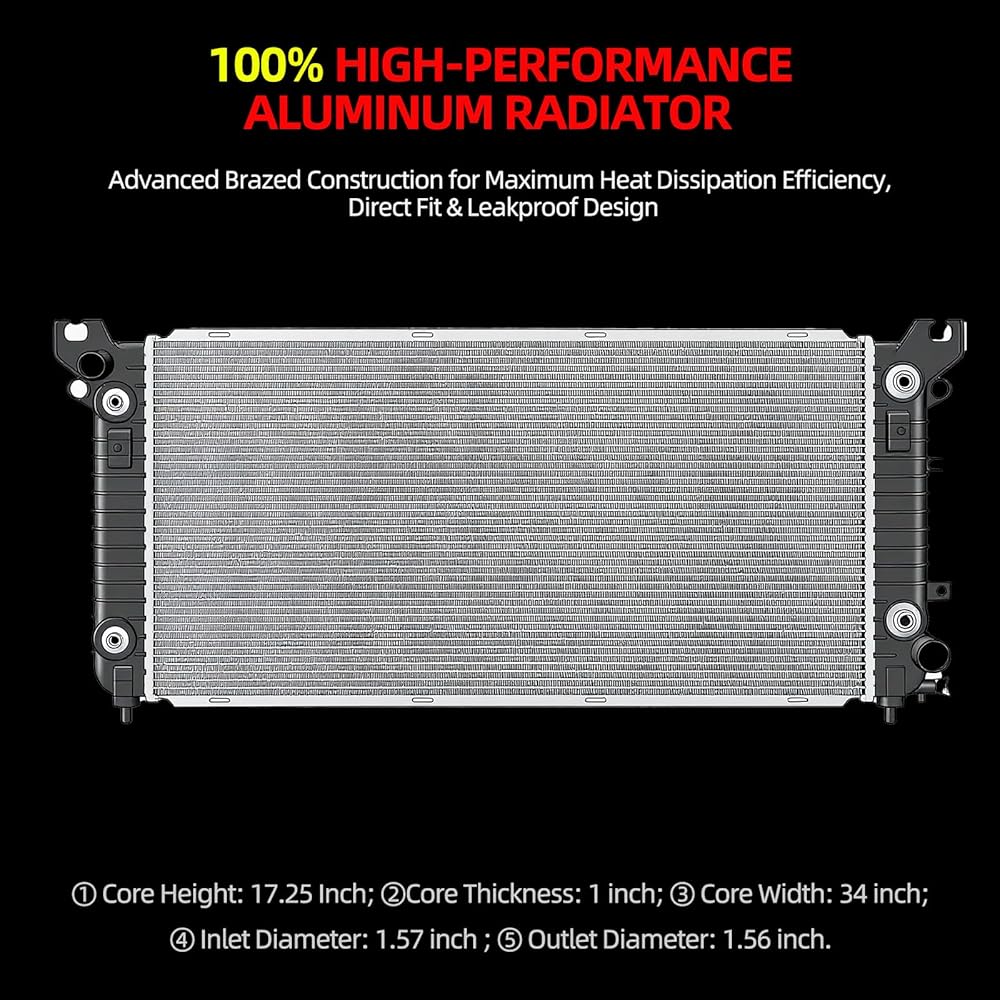 【OE FIT & EASY INSTALLATION】100% direct OEM fitment ensures a hassle-free installation process without any modifications required. Mounting points and connector locations match the original radiator exactly. Product Attributes:① Core Height: 17.25 Inch; ②Core Thickness: 1 inch; ③ Core Width: 34 inch; ④ Inlet Diameter: 1.57 inch ; ⑤ Outlet Diameter: 1.56 inch. OEM part numbers:13398;13723;13724;13725;23126402;23378655;23445967;675-02901;8013398;84062174;84207656;CU13398;CU13723;GM3010565. (Professional installation is recommended for optimal results).