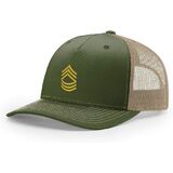 We offer two Richardson style options to choose from: Olive/Tan Five Panel Trucker and Pinch Front Olive Stuctured Snapback