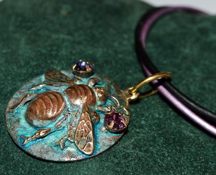 Verdigris Patina Queen Bee Pendant - European Crystals A queen bee is regarded as a preferred female that stands alone in the center of her world. So who among us is the Queen Bee? Tell them who you are with our exciting new First of it's kind "Queen Bee" collection, a collaboration of Elaine Coyne and Sara Mercik, one of our valued artisans. Verdigris patina solid brass pendant measures 1" in diameter with 24ss iris and tanzanite crystals. Dual purple and black leather rawhide measures 16"-18". Includes Artist's Statement and Designer Velvet Pouch with Trademark Tag.